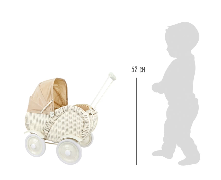 Im schnittig schönen Retrolook fährt dieser tolle Wagen aus hochwertig gearbeitetem Korbgeflecht auf einem Holzkasten die Puppen spazieren. Häkelbordüren in Creme sorgen für ein schönes Design. Ein lackierter Holzgriff, Schutzbleche und der Rahmen aus Metall geben Stabilität. Gummiringe auf den Metallrädern sorgen für leise Laufgeräusche.