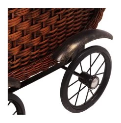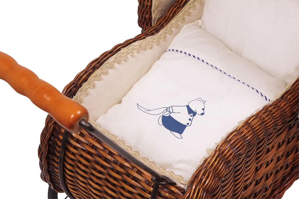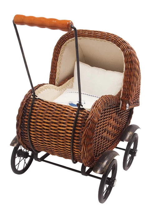 Wunderschöner Wagen aus Korbgeflecht für anspruchsvolle Puppenmuttis und als tolle Dekoration. Eine weiche Decke und Kissen mit süßem Motiv und das in oxidiertem Design gehaltene Metallgestell sowie die Schutzbleche ergänzen den Flair der alten Zeit! Die Räder haben Gummiringe für leise Laufgeräusche im Haus.