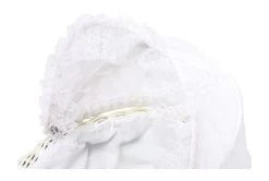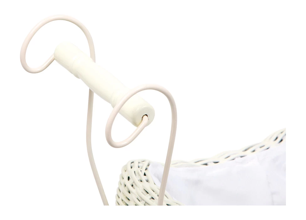 Zauberhafte Dekoration und stilvolles Spielzeug ist der in weiss gehaltene, geflochtene Korb auf einem Metallgestell. Gummiringe auf den Speichenrädern aus Metall sorgen für leise Laufgeräusche. Wunderschön ist das klappbare Verdeck aus zartem Textil mit weißem Spitzensaum und zarten Stickereien.