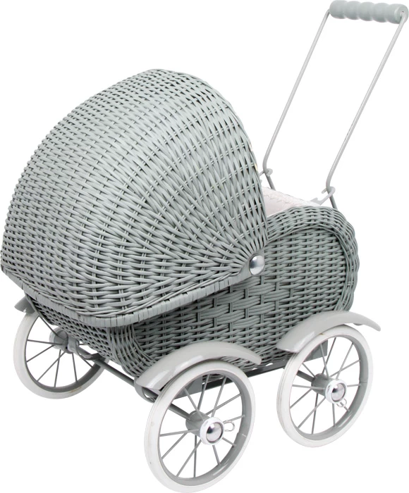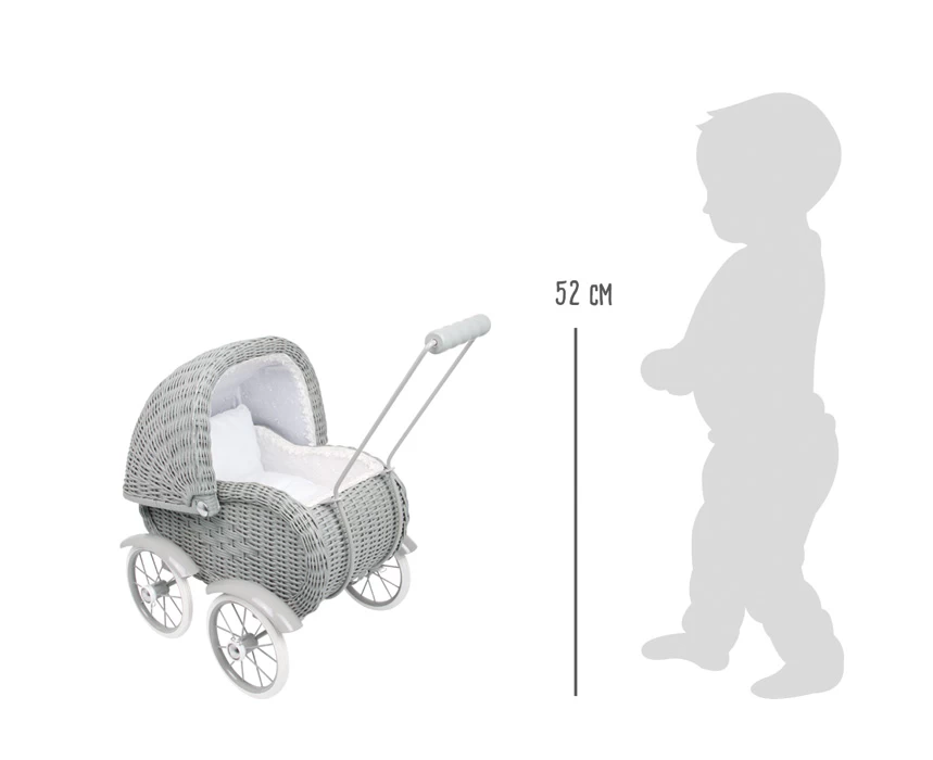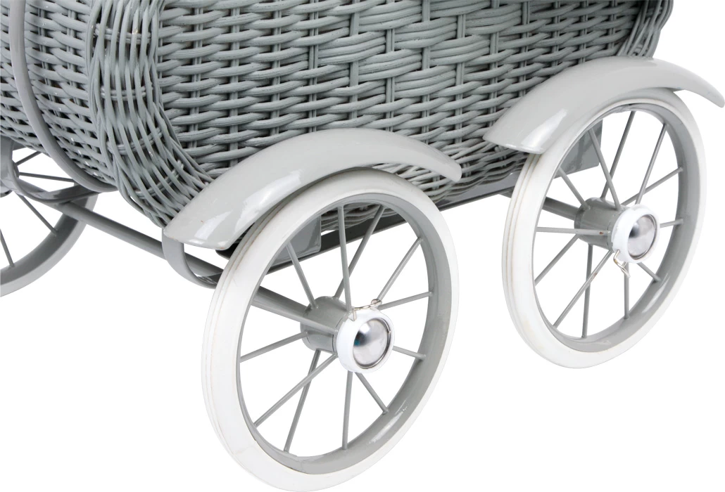 Ein wunderschöner Wagen im Stil alter Zeiten und in stahlgrauem Design bietet sich als Spielzeug für Puppeneltern oder als Dekoartikel an! Mit stabilem Metallgestell und Vollgummireifen für leise Laufgeräusche.