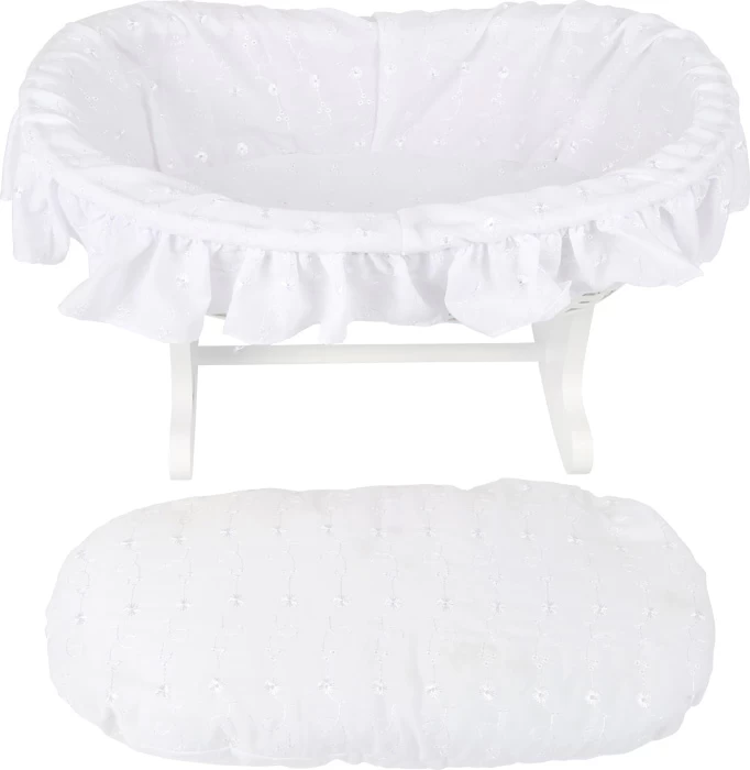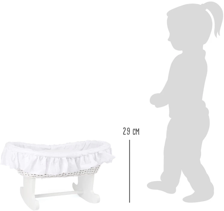 Hier können es sich Puppen ganz bequem machen! Mit dieser Puppenwiege aus Holz werden Puppen ganz sanft in den Schlaf geschaukelt. Eine herausnehmbare, weiche Matratze und die leichte Wiegefunktion lässt Puppen schnell ins Land der Träume schweben. Der Weidenkorb kann von den Puppeneltern ganz leicht umgestellt werden und passt farblich sehr gut zum filigran bestickten Stoff.
