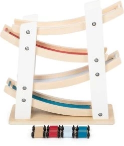 Auf die Plätze, fertig, Abfahrt! Diese Klick-Klack-Rennbahn aus Holz mit stabilem Standfuß verspricht rasante Action, wenn die vier kleinen Holzautos die Rampen hinuntersausen. Auf ihrer Fahrt von Etage zu Etage schlagen sie lustige Purzelbäume und sorgen für großen Spaß. Weiß lackiertes und naturbelassenes Holz in Kombination mit der klassischen Farbgestaltung der Rampen macht die Bahn zu einem Hingucker, der sich dezent in jedes Kinderzimmer einfügt.