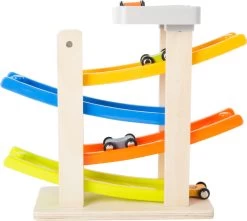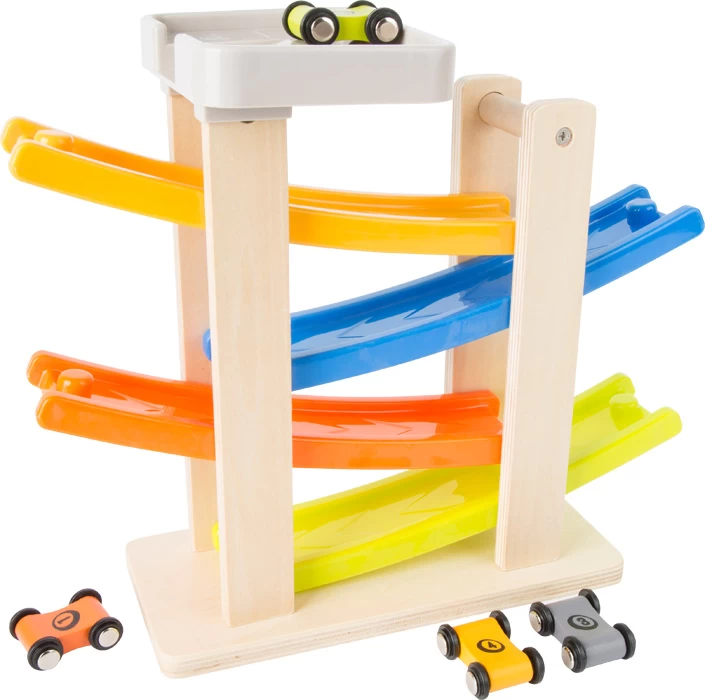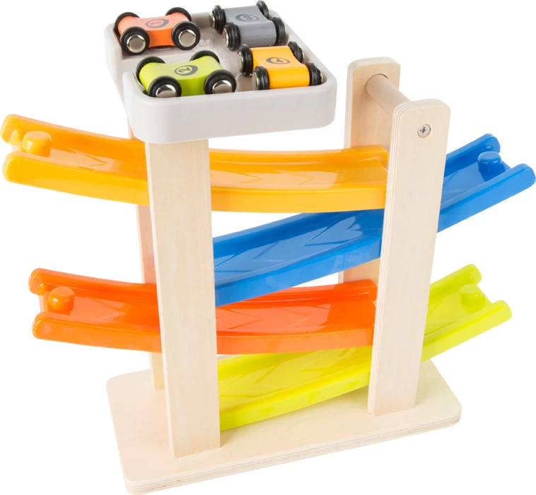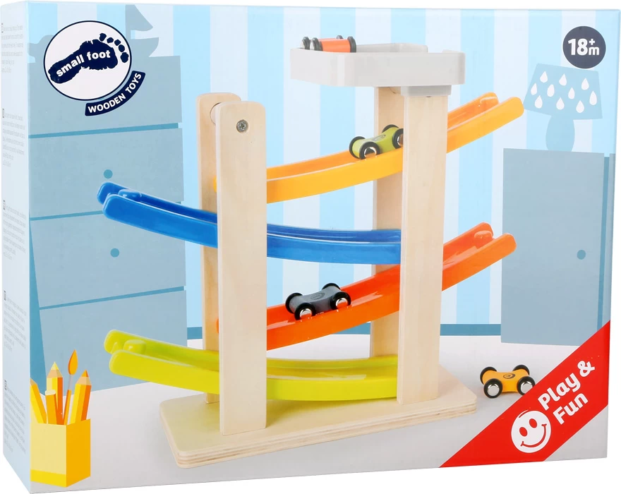 Die Rennbahn aus Holz hat einen stabilen Standfuß und ist gut gerüstet für den harten Einsatz im Kinderzimmer. Auf die Plätze, fertig, los!