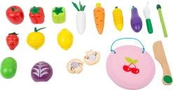 Dieses Gemüse- und Fruchtallerlei hat Einiges zu bieten. Alle Sorten Obst und Gemüse sind aus Holz gefertigt, originalgetreu gestaltet und werden mit Ausnahme von Frühlingszwiebel und Spargel durch einen Klettverschluss zusammen gehalten. Ein Schälmesser und ein Teller aus Holz sind als praktische Küchenhelfer für die Zubereitung dabei.