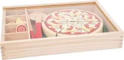 Wer hat Lust auf Pizza? Diese Pizza aus Holz ist mit allerlei Köstlichkeiten belegt und schult auf leckere und spielerische Art und Weise die Motorik und den Umgang mit Werkzeugen. Die einzelnen Stücke der Pizza lassen sich mit dem hölzernen Pizzaroller zerschneiden und in sechs Teile zerteilen. Dank der Klettverschlüsse zwischen den Pizzastücken lassen sich diese immer wieder zu einer ganzen Pizza zusammenfügen. Geliefert wird alles in einer praktischen Holzkiste.