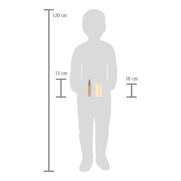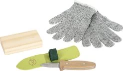 | Maße cm | Messer ca. 13 x 3 x 1 cm, Holzblock ca. 10 x 5 x 2 cm, Handschuhgröße: XS (Schnittschutzklasse 5) |