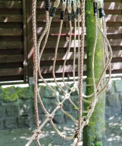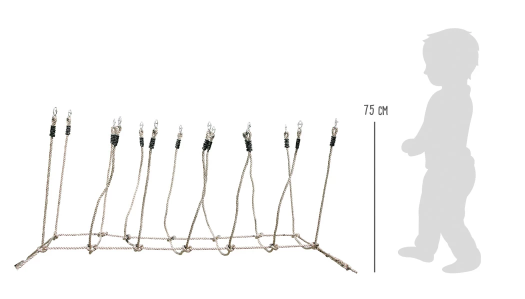 Begeistertes Klettern auf der Brücke aus robusten Kunststoffseilen schult das Gleichgewicht und das Körperempfinden spielerisch! Ein „Muss“ für das Klettergerüst im Garten und auch schnell zwischen zwei Bäumen gespannt ein Hit! 14 metallene Ösen dienen der Befestigung und auf den unteren Querverbindungen finden die Füße guten Tritt.