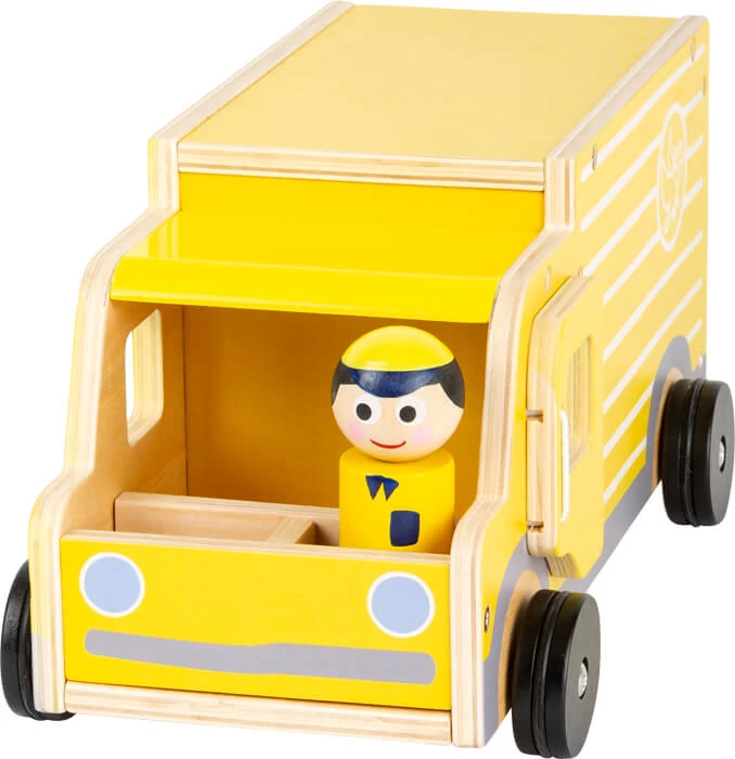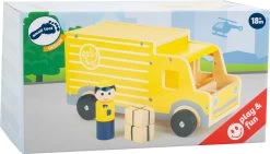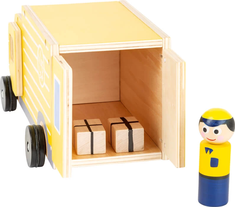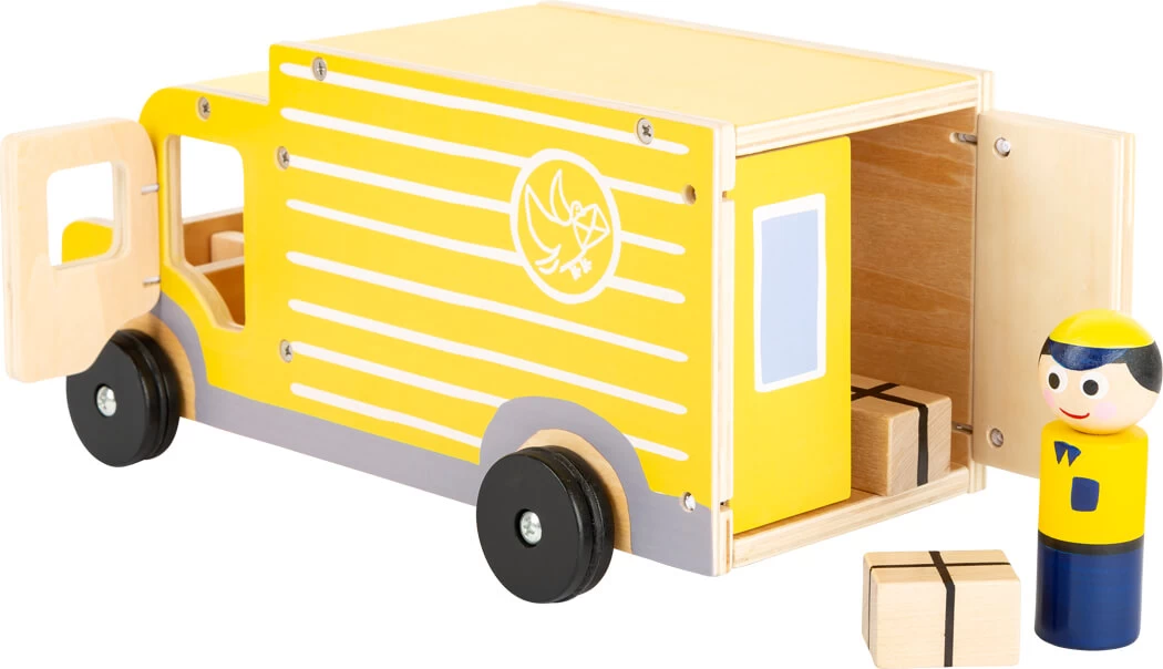 Der Paketdienst ist da! Dieses extragroße Spielauto aus Holz liefert bestellte Pakete direkt vor die Haustür. Durch die Türen, die aufgeklappt und festgestellt werden können, lassen sie sich kinderleicht ein- und ausladen.
