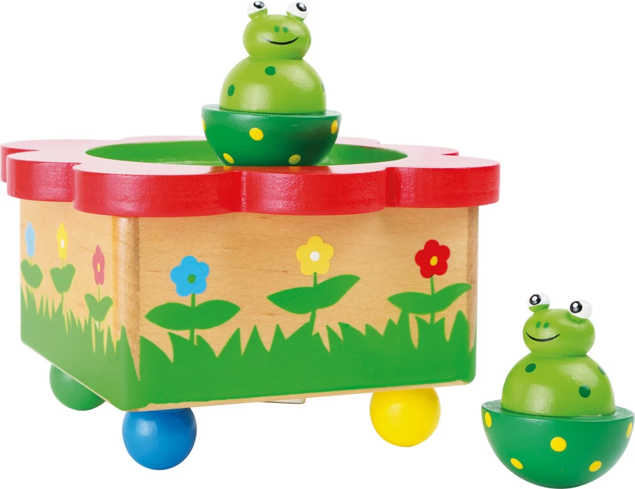 Auf dem Froschteich wird getanzt! Die farbenfrohe Spieluhr aus Holz spielt die Melodie „Merrily we roll along“, während die beiden magnetischen Frösche sich dazu drehen.