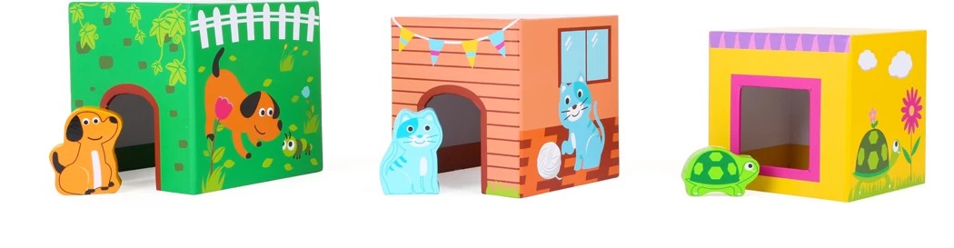 Hier herrscht ein buntes Treiben. Denn alle Haustiere müssen ihrem richtigen Schlafplatz zugeordnet werden! Die unterschiedlichen großen Würfel können so aufeinandergestellt werden, dass an der Seite das Herrchen der süßen Tiere erscheint