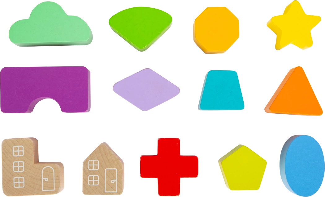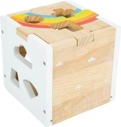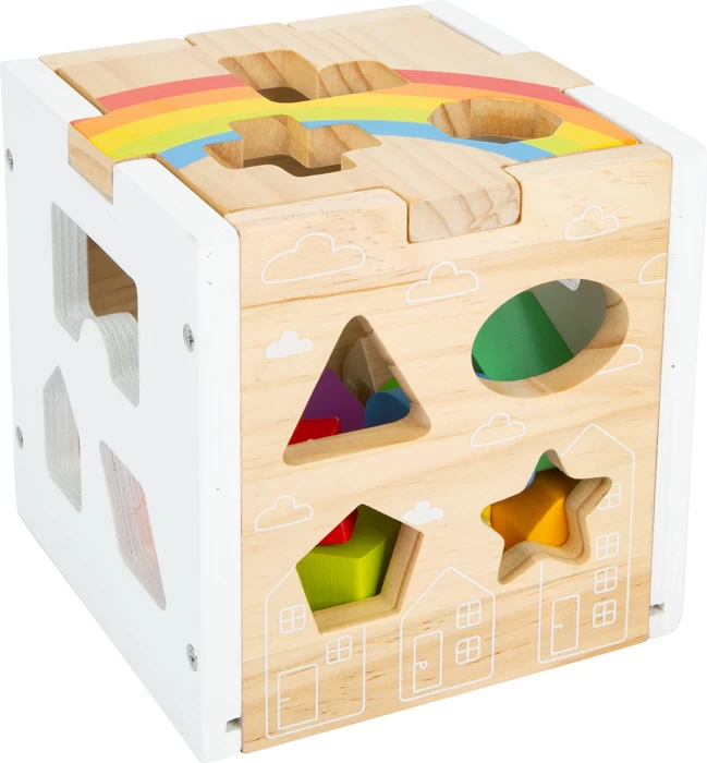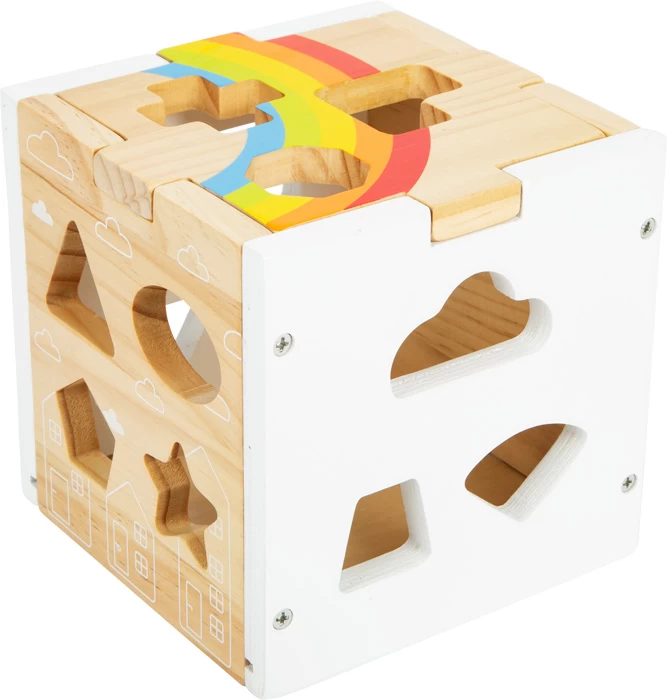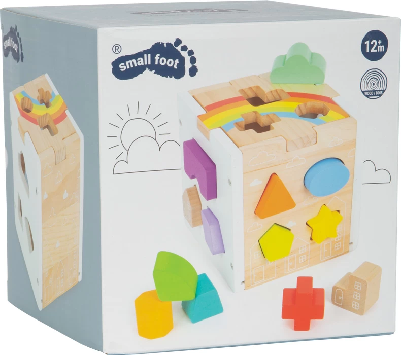 Dieser moderne Steckwürfel aus robustem Holz kombiniert schlichtes Weiß, leuchtende Regenbogenfarben und einen hohen sichtbaren Vollholzanteil. 13 unterschiedlich geformte, farbige und zum Teil naturbelassene Steckelemente trainieren Farb- und Formerkennung sowie motorische Fähigkeiten. Neben klassischen geometrischen Formen gibt es auch Wolken, Sterne und Häuser zum Stecken!