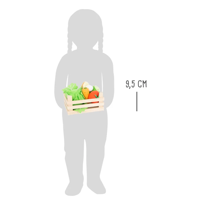 Die Stiege aus Holz ist gefüllt mit einer Gurke, einer Karotte, einer Tomate, einem Pilz und einem Salatkopf aus weichem Plüsch. Das Besondere: die Blätter des Salatkopfes sind mit Klett am Salatkopf befestigt und abnehmbar.