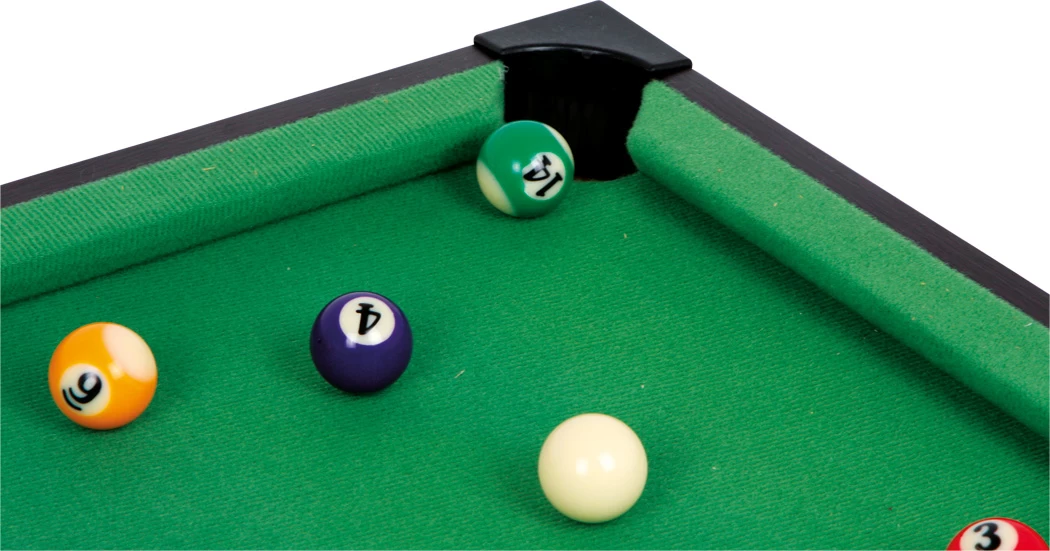 Eine kurzweilige Beschäftigung und spielerische Schulung für die Motorik und Hand-Augen-Koordination ist dieser kleine Pool-Tisch! Mit den zwei Queues (ca. 66 cm), Kugeln, Dreieck und Kreide werden tolle Partien auf dem Tisch die Spieler begeistern! Toll geeignet auch für Reisen, die kleine Pause im Büro, schnelle Spiele zwischendurch oder Partyturniere!