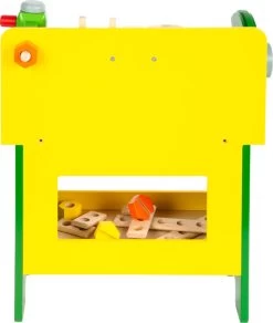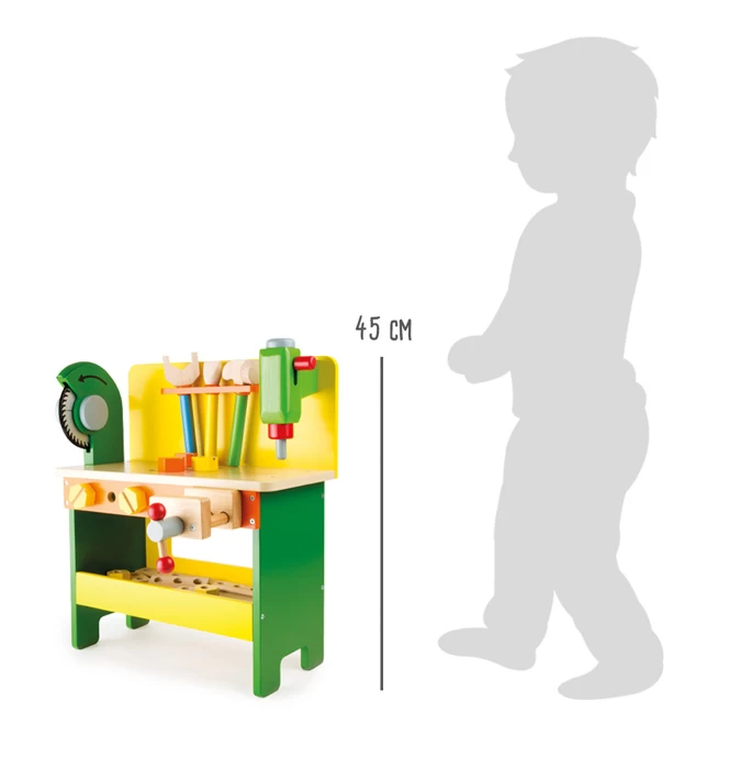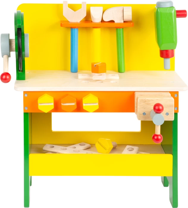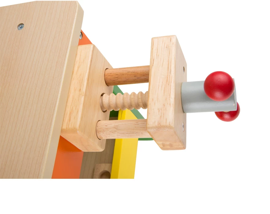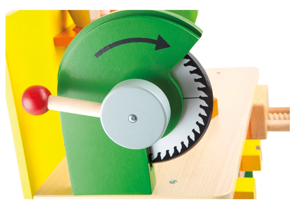 Ausgerüstet mit abnehmbarer Bohrmaschine und fixierter Kreissäge, ist diese Werkbank mit Schraubstock der perfekte Arbeitsplatz für kleine Handwerker! Stabil gearbeitet aus verschiedenen Hölzern, in leuchtenden Farben und klar lackiert. Mit Hammer, Schraubendreher und -schlüssel sowie diversen Schrauben, Muttern und flachen Lochplättchen ein besonders tolles Motorikspielzeug!