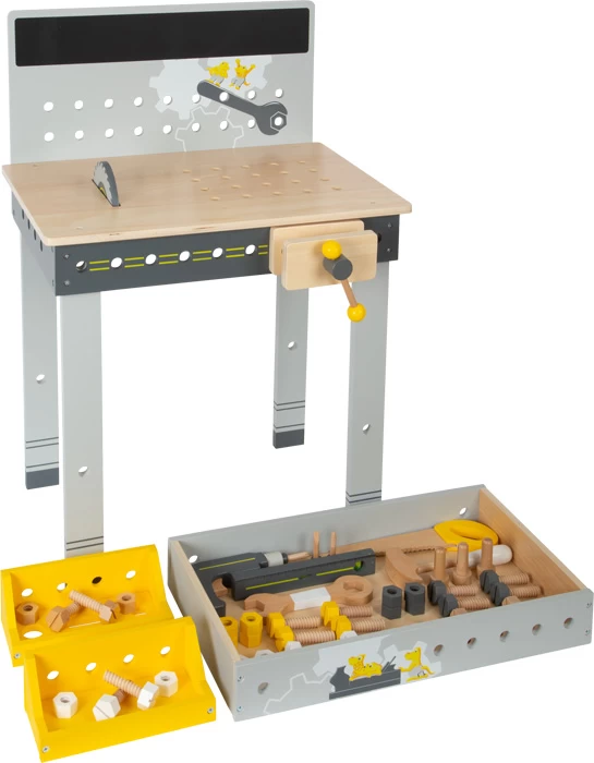 | Inhalt | 1 Werkbank, 1 Kreissäge, 1 Akkuschrauber mit 3 Bits, 1 Wasserwaage, 1 Schraubstock, 1 Hammer, 1 Schraubenschlüssel, 1 Schraubendreher, 1 Säge, 2 anschraubbare Kisten, 6 Konstruktionsleisten, 16 Schrauben, 16 Muttern, 3 Nägel. |