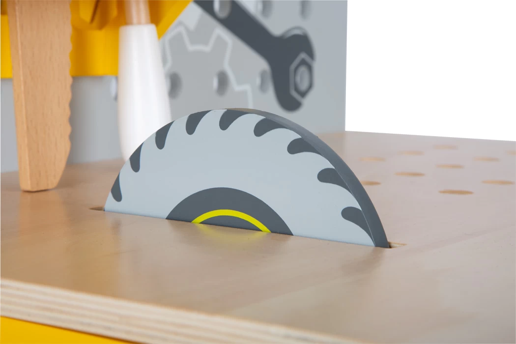 Sägen, schrauben, hämmern! Zusammen mit niedlichen Miniwobs werden mit dieser Werkbank aus Holz handwerkliches Geschick erprobt und feinmotorische Fähigkeiten geschult. Funktionale Besonderheiten sind die integrierte Kreissäge, die Wasserwaage und der Akkuschrauber mit drei auswechselbaren Bits. Auf der beschreibbaren Tafelfläche können die neusten Bauprojekte skizziert werden und je nachdem wo die modularen Aufbewahrungskästchen angeschraubt werden, fungieren sie als Werkzeughalter oder Stauraum. Besonderes Highlight: Kinder können schon beim Aufbau der Werkbank mitwirken! Inkl. 8 Werkzeugen und umfangreichem Zubehör.