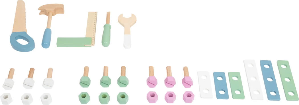 Zubehör bestehend aus 9 Schrauben, 9 Muttern und 6 Lochleisten. Bereits beim Aufbau können die Kinder mithelfen und ihr handwerkliches Geschick unter Beweis stellen. Durch die skandinavische, zurückhaltende Farbgestaltung passt diese Werkbank zu jeder Wohnungseinrichtung. Sowohl für Mädchen als auch für Jungen das passende Rollenspielzeug.