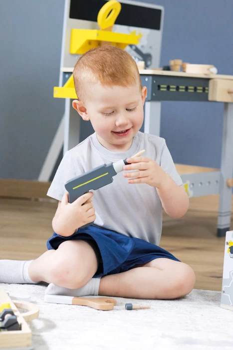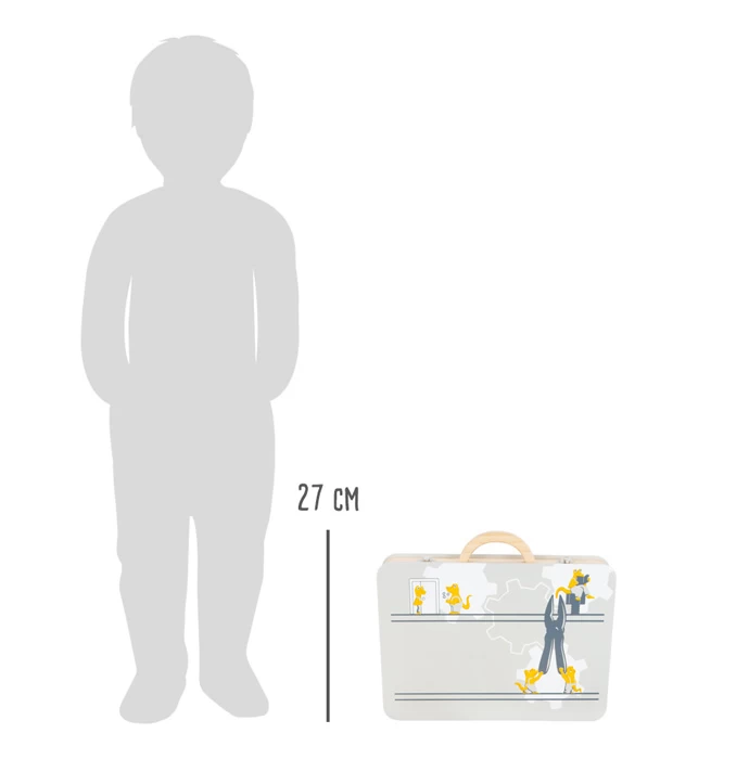 Mini-Handwerker aufgepasst! Mit diesem Werkzeugkoffer aus Holz in klassischen Werkstattfarben werden Kinder im Rollenspiel zu Heimwerker-Profis. Realitätsnahe Zubehörteile und Werkzeuge wie ein Tischlerwinkel mit Wasserwaage oder ein handlicher Akkuschrauber, dessen Bits mithilfe von Magneten gewechselt werden können, fördern den Spielspaß und die Motivation für neue Bauprojekte! Flexible Gummibänder im Koffer halten das Werkzeug auch unterwegs an Ort und Stelle. Der sichtbare Holzanteil passt zur Werkstattoptik und dezente Illustrationen fleißiger Miniwobs regen die kindliche Phantasie an. Inkl. 6 Werkzeugen aus Holz und umfangreichem Zubehör.