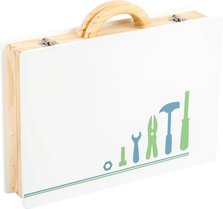Zubehör bestehend aus 5 Werkzeugen, 1 Bohrer, 3 Bits, 11 Schrauben, 11 Muttern und 12 Lochleisten. Durch die Klippverschlüsse lässt sich alles sicher verstauen und mit den Tragegriffen aus Holz ist der Werkzeugkoffer für Jungen und Mädchen bereit für den nächsten Heimwerkereinsatz.