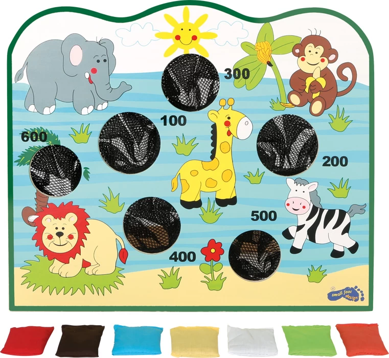 Jahrmarktstimmung im Kinderzimmer! Das kompakte Wurfspiel mit süßen Afrika-Tieren erfordert zielgenaues Werfen. Die kleinen Sandsäckchen müssen in die verschieden großen Löcher mit unterschiedlich hoher Punktzahl geworfen werden. Schult Hand-Augen-Koordination und Motorik!
